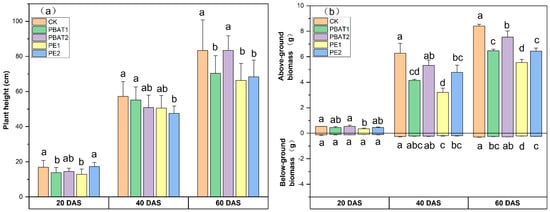 Effects of different types and sizes of MPs on plant height (a) and aboveground and belowground biomass (b) at 20, 40, and 60 days after sowing. Different lowercase letters indicate significant differences between treatments (p < 0.05). CK: Control, plants treated with clean soil without PE and PBAT. PBAT1 and PBAT2: plants treated with poly (butylene adipate-co-terephthalate) microplastics at sizes of 100 μm and 1000 μm, respectively. PE1 and PE2: plants treated with polyethylene microplastics at sizes of 100 μm and 1000 μm, respectively.