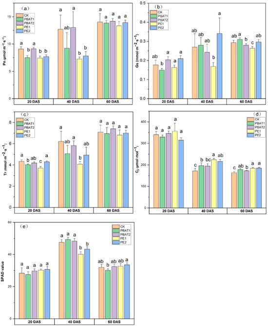 Effects of different types and sizes of MPs on Pn (a), Gs (b), Tr (c), Ci (d), and SPAD (e) values at 20, 40, and 60 days after sowing. Different lowercase letters indicate significant differences between treatments (p < 0.05). CK: Control, plants treated with clean soil without PE and PBAT. PBAT1 and PBAT2: plants treated with poly (butylene adipate-co-terephthalate) microplastics at sizes of 100 μm and 1000 μm, respectively. PE1 and PE2: plants treated with polyethylene microplastics at sizes of 100 μm and 1000 μm, respectively.