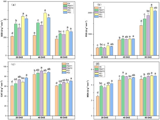 Effects of different types and sizes of MPs on the activities of SOD (a), POD (b), CAT (c), and the contents of MDA (d) at 20, 40, and 60 days after sowing. Different lowercase letters indicate significant differences between treatments (p < 0.05). CK: Control, plants treated with clean soil without PE and PBAT. PBAT1 and PBAT2: plants treated with poly (butylene adipate-co-terephthalate) microplastics at sizes of 100 μm and 1000 μm, respectively. PE1 and PE2: plants treated with polyethylene microplastics at sizes of 100 μm and 1000 μm, respectively.