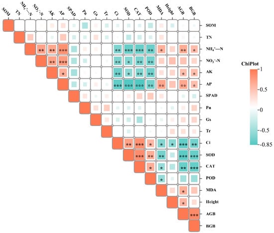 Pearson correlation between buckwheat growth parameters and soil chemical properties. SOD, superoxide dismutase; POD, peroxidase; CAT, catalase; MDA, malonic dialdehyde; Pn, net photosynthesis rate; Gs, stomatal conductance; Tr, transpiration rate; Ci, intercellular CO2 concentration; SPAD, SPAD value; SOM, soil organic matter; TN, total nitrogen content; NH4+-N, ammonium nitrogen; NO3−-N, nitrate nitrogen; AP, available phosphorus; AK, available potassium; Height, plant height; AGB, aboveground plant biomass; and BGB, belowground plant biomass. *, **, and *** indicate significant correlations at the 0.5, 0.1, and 0.001 levels, respectively.