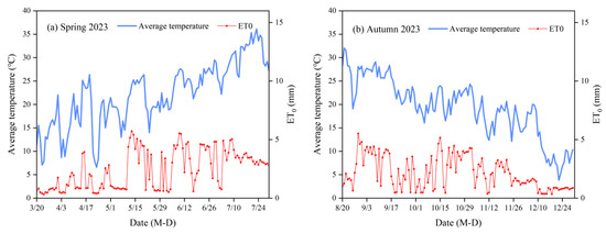 Average temperature and reference crop evapotranspiration (ET0) during the tomato growing seasons in spring and autumn 2023.