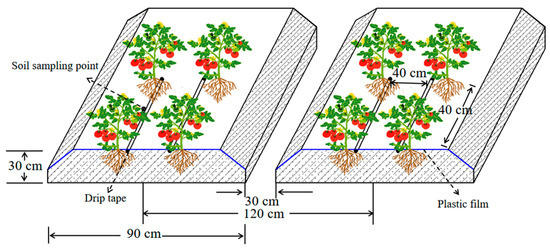 The tomato variety utilized in the experiment was ‘Jinpeng 101’, transplanted on 31 March 2023 (Spring 2023) and 25 August 2023 (Autumn 2023) and harvested on 22 July 2023 (Spring 2023) and 31 December 2023 (Autumn 2023). To ensure the survival of tomato seedlings, each plot received 30 mm of irrigation water after transplanting (based on the existing soil water content). The irrigation was stopped approximately 10 days before harvest. Each experimental plot was 7.1 m in length and 0.9 m in width. A buffer zone measuring 0.3 m in width was established between the two adjacent plots. Two parallel drip irrigation lines were installed in each plot (the spacing is 0.4 m, the pipe diameter is 16 mm, and the flow rate is 2 L/h), with 14 tomato plants arranged along each drip line, maintaining a row spacing of 40 cm (Figure 2). The study employed a completely randomized block design, comprising 12 treatments with 3 replicates. There were three irrigation intervals (the irrigation interval is set according to the suggestions of local farmers and some pre-experiments): D1 (4-day interval), D2 (7-day interval), and D3 (10-day interval), and four irrigation levels: W1 (125% ETc), W2 (100% ETc), W3 (75% ETc), and W4 (50% ETc), where ETc represents the crop evapotranspiration, calculated as follows: