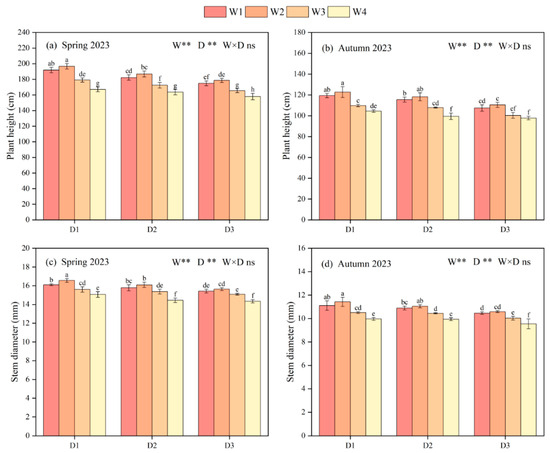 Plant height and stem diameter at tomato maturity stage in spring 2023 (a,c) and autumn 2023 (b,d). Data are presented as mean values (n = 3). Duncan’s multiple range test was employed to determine significant differences among the various letters of bar tops (p < 0.05). **, p < 0.01; ns, non–significant. W: irrigation level, D: irrigation interval.