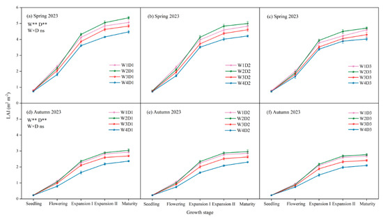 Leaf area index (LAI) at different growth stages of tomato in spring 2023 (a–c) and autumn 2023 (d–f). **, p < 0.01; ns, non–significant. W: irrigation level, D: irrigation interval.