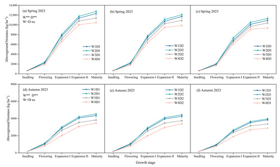 Aboveground biomass (kg ha−1) at different growth stages of tomato in spring 2023 (a–c) and autumn 2023 (d–f). **, p < 0.01; ns, non–significant. W: irrigation level, D: irrigation interval.