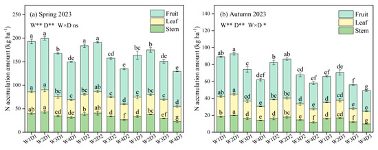 Effects of different irrigation strategies on nitrogen uptake in tomato organs at the mature stage (spring (a) and autumn (b)). *, p < 0.05, **, p < 0.01; ns, non–significant. W: irrigation level, D: irrigation interval. Different letters indicate significant difference at p < 0.05 for treatments.