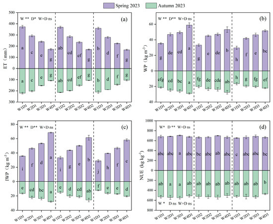 Effects of different irrigation levels and irrigation intervals on (a) crop evapotranspiration (ET), (b) water productivity (WP), (c) irrigation water productivity (IWP), and (d) nitrogen use efficiency (NUE). *, p < 0.05, **, p < 0.01; ns, non–significant. W: irrigation level, D: irrigation interval. Different letters indicate significant difference at p < 0.05 for treatments.