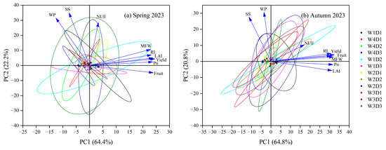 Principle component analysis (PCA) bi-plots (spring (a) and autumn (b)). Circles represent the degree of correlation between the parameters. The narrower the circle, the stronger the correlation. The lines from the center point of the biplot show the correlations (negative or positive) of the different variables. Total yield (Yield), single fruit weight (MFW), root length (LR), soluble sugar (SS), leaf area index (LAI), nitrogen use efficiency (NUE), water productivity (WP), fruit absorption nitrogen (Fruit), net photosynthetic rate (Pn).
