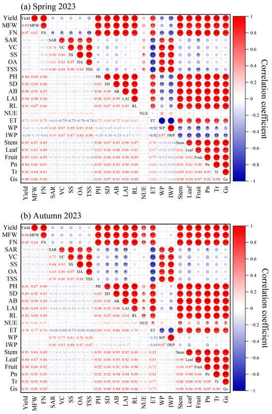 Correlation analysis was performed for different relevant indicators in different treatments (spring (a) and autumn (b)). Total yield (Yield), single fruit weight (MFW), fruit number per plant (FN), sugar-acid ratio (SAR), vitamin C (VC), soluble sugar (SS), organic acid (OA), total soluble solids (TSS), plant height (PH), stem diameter (SD), aboveground biomass (AB), leaf area index (LAI), root length (LR), nitrogen use efficiency (NUE), crop evapotranspiration (ET), water productivity (WP), irrigation water productivity (IWP), stem absorption nitrogen (Stem), leaf absorption nitrogen (Leaf), fruit absorption nitrogen (Fruit), net photosynthetic rate (Pn), stomatal conductance (Gs), transpiration rate (Tr). Larger circles have higher correlations and vice versa. *, p < 0.05, **, p < 0.01.