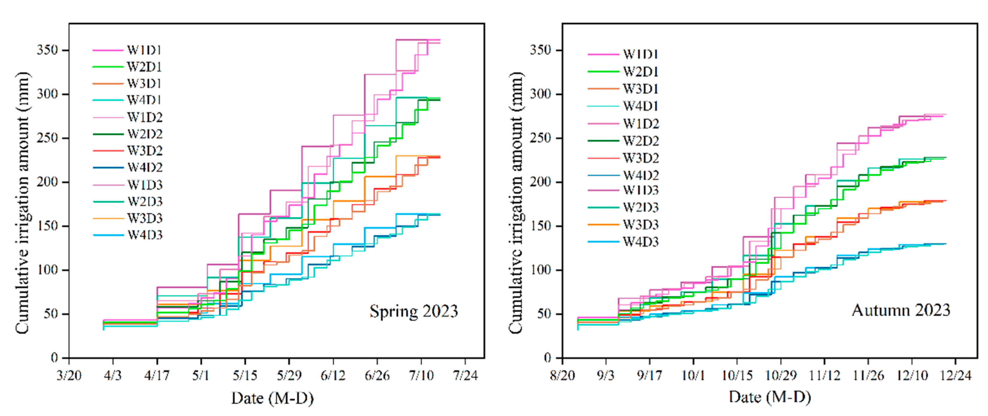 Irrigation scheduling for the whole growth period of tomato in spring 2023 and autumn 2023. Irrigation (100% ETc) in spring 2023 for D1, D2, and D3 was 295.6 mm, 293.1 mm, and 295.9 mm, respectively. In autumn 2023, it was 226.2 mm, 228.1 mm, and 226.1 mm, respectively.
