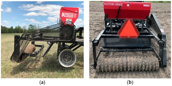 A four-row seeder (Plotter Choice, Kasco Manufacturing, 170W600 N, Shelbyville, IN 46176, USA) was used for the experiment. It consisted of four disc-openers, a soil cover plate, finger tines, and a press roller (Figure 1a). The opener discs had a diameter of 360 mm and a spacing of 220 mm. Behind the discs, the soil-covering plate and the finger tines covered the seeds. The press roller, composed of 17 serrated discs (diameter: 240 mm; thickness: 55 mm) arranged coaxially (Figure 1b), compressed the soil. At the same time, the press roller, driven by the ground, was connected to the fluted seed meter through a series of sprockets and chains.