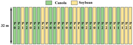The experiment was conducted over two years (2022 and 2023) to examine the effects of different levels of press roller compaction on soil properties and early plant growth. The experimental design was a factorial treatment layout. The field treatments were the combinations of two crop types (Canola and soybean) and three soil pressing levels at the seeding by the press roller: no passes (P0), one pass (P1), and two passes (P2). The selection of soybean and canola seeds was based on their shared epigeal germination characteristics, where cotyledon emergence is susceptible to soil mechanical impedance during seedling establishment, coupled with their distinct size variation. Each treatment was replicated five times, giving a total of 30 plots (two crops × three pressing levels × five replicates). Each plot was 1.52 m wide to accommodate one pass of the seeder, and the plot length was 32 m. Treatments were randomly distributed in the plots as shown in Figure 2.