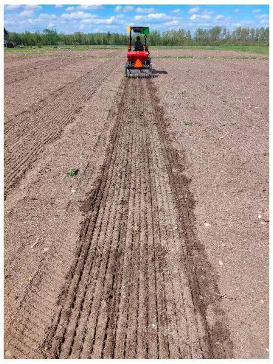 The experiment was performed on a field located in the RM of Piney, Manitoba, Canada (49°07′15″ N, 96°07′56″ W). The soil comprised 73.5% sand, 23.6% silt, and 2.9% clay, and was classified as sandy loam by the USDA soil texture triangle [26]. In 2022 and 2023, the average highest temperature at this location was 22.9 °C and 23.4 °C, the lowest temperature was 11.2 °C and 10.5 °C, the relative humidity was 71% and 67%, the rainfall was 0.72 and 0.8 mm/day, and the average wind speed was 12.61 and 13.31 km/h, respectively [27]. Before seeding, the field was tilled with a disc plow, followed by a spike harrow. After tilling the soil, there were few residues from the previous crop on the soil surface.