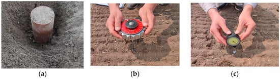 Soil properties, including dry bulk density and soil moisture content, were measured at the time of seeding to characterize the initial soil conditions of the field. Soil samples were taken using the soil core method in seven random locations in the field prior to the seeding and compaction operations. The soil core sampler (Figure 4a) was 54 mm in diameter and 54 mm in height. Soil samples were weighed immediately after sampling. Then, they were oven-dried at 105 °C for 24 h to determine the soil moisture content (dry basis) and soil dry bulk density.
