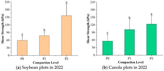 As shown in Table 2, the data indicated that the compaction factor had a highly significant impact on the soil shear strength (p < 0.01), crop type had no significant impact on the soil shear strength (p > 0.05), and the interaction between crop type and compaction factor had a significant impact on it. The measurement data from 2022 and 2023 showed significant differences in soil shear strength among the three different compaction treatments, both in the canola and soybean plots (Figure 6). The trends were similar, with soil shear strength increasing with a greater number of press roller passes, (53.9% for the P1 treatment and 114.3% for P2) when compared to P0. The compaction of the press roller increased the contact between soil particles, thereby increasing the bonding force between the basic particles [30]. This explains the increased soil shear strength. The type of crop planted did not make any difference in the shear strength of the soil, as expected. Slightly higher overall shear strength was observed in 2022 when compared to 2023, possibly due to the differences in soil moisture conditions between the two years.