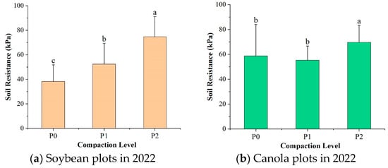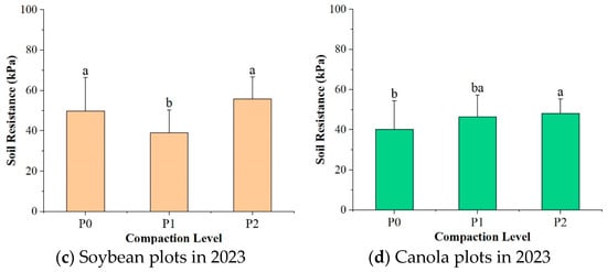 Results indicated that the compaction factor had a highly significant impact on soil resistance (p < 0.01) and crop type, and the interaction between the two factors had no significant impact on soil resistance (p > 0.05). Only the soybean field in 2022, under different compaction treatments, showed that the soil surface resistance increased significantly as the compaction level increased (Figure 7a). In the canola field in 2022, after one pass of the press roller, the soil surface resistance was not significantly changed, as indicated by the same statistical level of both P0 and P1 (Figure 7b). However, the soil surface resistance after two passes of the press roller (P2) was the highest among all the treatments. As for the results from 2023, the soybean field showed an unexpected trend (Figure 7c), whereas the canola field showed an increasing trend of soil surface resistance with the increase in compaction level (Figure 7d). Compared to the data for soil shear strength (Figure 6), the data for soil surface resistance is more irregular. This could be attributed to the shallow measurement depth when collecting the soil surface resistance data. On the topsoil layer, the seeding operation caused some soil disturbance along the seed rows, but no soil disturbance between the seed rows, creating a nonuniform soil structure. This nonuniform area was where the soil surface resistance was measured and could be the reason for the irregular soil resistance data shown in Figure 7b,c. The results are consistent with the literature study by Usowicz [31], showing that there was a large difference in the semi-variance of soil surface resistance, and its relationship with machine-induced soil compaction was not significant. In general, mixed results for soil surface resistance were obtained for the treatments P0 and P1. However, the soil with P2 always had the highest soil surface resistance, which is supported by the soil mechanical theory.