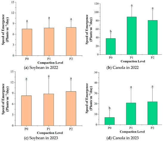 As shown in Table 2, crop types and compaction level, and the interaction between the two, had a highly significant impact on the speed of emergence (p < 0.01). In 2022, the canola and soybeans seeds took 7 days and 6 days, respectively, to emerge, while in 2023, both canola and soybeans took the same 5 days to emerge. These are typical for the given conditions of temperature and soil moisture. There were no significant differences in the speed of soybean emergence in 2022 (Figure 8a). Plant emergence remained relatively constant around eight plants·m−1/day for all compaction treatments. However, the speed of canola emergence was significantly lower in the P0 treatment than in the P1 and P2 treatments (Figure 8b). The one pass of the press roller (P1) significantly increased the speed of canola emergence by 57.9%. However, further compaction (P2) of the soil did not significantly affect the speed of emergence. Furthermore, the compaction effect trend in 2022 was confirmed by the data in 2023 (Figure 8c,d). Results indicated that soil compaction by the press roller did not have a negative impact on the speed of canola emergence. In contrast, compaction promoted a fast speed of emergence. This could possibly be due to the better soil–seed contact resulting from the compression action of the press roller. Another possible explanation is the fact that compacted soil preserves soil moisture content by reducing evaporation. The higher soil moisture content favors fast germination and cotyledon growth, reflected by the fast speed of emergence. The results showed that soybeans were less sensitive to soil compaction when compared to canola. This was in line with the findings in the literature. Excessive soil compaction can lead to degradation of the physical, chemical, and biological properties of sol, which negatively impacts crop growth and consequently reduces agricultural yields [32]. However, soil compaction at different intensities can be a favorable or unfavorable factor for the emergence of specific crop seeds [30]. This also reflected the sensitivity of smaller canola seeds to soil compaction [33].