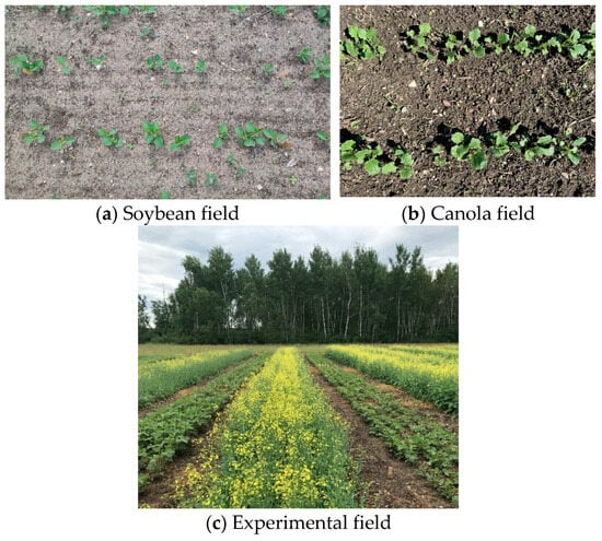 The variety of soybean seeds used were Croplan RX000918, and that of the canola seeds were InVigor L340PC, provided by local seed suppliers in Manitoba, Canada. They were seeded in four rows per plot using 300 mm row spacing. The target seeding depth for soybean was 30 mm, recommended by Manitoba Agriculture, and that for canola was 12.5 mm, recommended by the Canola Council of Canada [28]. The travel speed of the tractor was 2.1 m·s−1 for the seeding of both crops.
