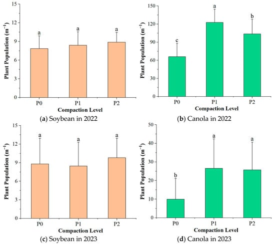 Plant population of soybean and canola in 2022 and 2023; P0, P1, and P2 stand for no pressing, pressing once, and pressing twice, respectively, by the seeder press roller; means followed by different letters are significantly different according to Duncan’s multiple range test at the significance level of 0.05; error bars are standard deviations.