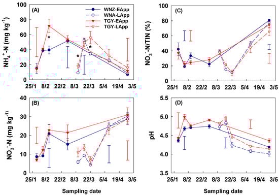 - Dan, X.; Chen, Z.; Dai, S.; He, X.; Cai, Z.; Zhang, J.; Müller, C. Effects of changing temperature on gross N transformation rates in acidic subtropical forest soils. Forests 2019, 10, 894. [Google Scholar] [CrossRef]