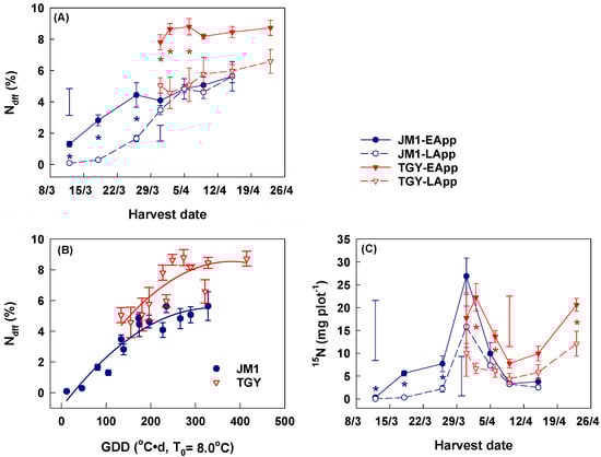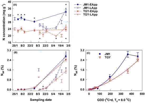 4.1. Effect of N Topdressing Timing on N in Young Spring Shoots of Early- and Late-Sprouting Cultivars