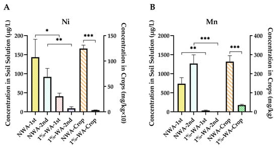 Concentration of (A) Ni, (B) Mn, (C) Zn, and (D) Cd in soil solution and crops. Asterisk indicates significant differences between groups, with the number of asterisks indicating the level of significance (* p < 0.05; ** p < 0.01; *** p < 0.001).