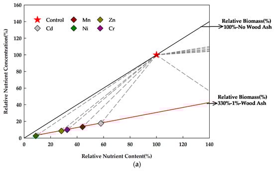 Nutrient vector diagrams of the measured elements in the two treatments, No Wood Ash and 1%-Wood Ash: (a) increase in relative nutrient content; (b) decrease in relative nutrient content. The diagram illustrates the relative nutrient concentration and relative nutrient content of each treatment compared to the control. The black solid line represents 100% relative biomass, while the red solid line indicates the relative biomass in the wood ash treatment. The dashed lines represent vectors originating from the control reference point.
