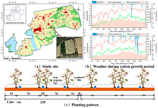 Southern Xinjiang holds a significant position in the cotton industry of Xinjiang and even China. The mechanization of cotton sowing and harvesting has been progressively implemented, alongside the widespread adoption of the “dry sowing and wet seedling emergence” technique to maximize crop yield and water productivity [1]. However, arid regions face challenges such as low precipitation, high evaporation, unsustainable groundwater exploitation, and inefficient irrigation practices, leading to declining cotton yields and constraints on industry development [2,3].