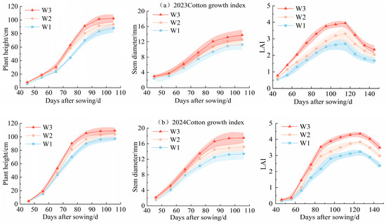 Figure 2 shows the dynamic changes in cotton plant height, stem diameter, and LAI under different irrigation levels or amounts during the experimental period of two years, all of which had significant effects (p < 0.05). Under the same irrigation level or amount, the height and stem diameter of cotton rapidly increased as the growth cycle progressed, reaching a gradually stable state during the flowering period (90 days after sowing). During the stable growth stage of cotton, in 2023, the plant heights were as follows: 88.1 cm for treatment W1, 93.5 cm for treatment W2, and 102.3 cm for treatment W3; the stem diameters were, respectively, 11.3 mm for treatment W1, 12.5 mm for treatment W2, and 13.8 mm for treatment W3. The plant height of treatment W3 increased by 16.11% and 9% compared with treatments W1 and W2, respectively; the stem diameter increased by 22.12% and 10.4%. In 2024, the plant heights were, respectively, 97.4 cm for treatment W1, 103.8 cm for treatment W2, and 109.2 cm for treatment W3; the stem diameters were: 13.4 mm for treatment W1, 15.2 mm for treatment W2, and 17.5 mm for treatment W3. The plant height of treatment W3 increased by 12.11% and 5.2% compared with treatments W1 and W2, respectively; the stem diameter increased by 30.6% and 15.13%. The LAI changes exhibited a unimodal curve, reaching their peak at 115 days after sowing in both 2023 and 2024, with significant increases observed across treatments. The above analysis indicates that under the “one film, three pipes, four rows” planting model, high-level irrigation can significantly promote the growth and development of cotton.