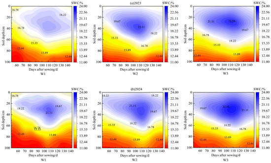 As shown in Figure 3, the amount of irrigation affects the spatiotemporal distribution soil moisture in the 0–100 cm soil layer of cotton fields. The trend of soil moisture content changes is basically consistent throughout the growth period for all treatments. When irrigation amount increases, the soil’s moisture retention capacity is enhanced. As the growth period progresses, soil moisture content first increases and then decreases vertically, with minor differences in moisture content between treatments in the deeper layers (60–100 cm) and significant differences in the middle layers (30–60 cm). In 2023, the average soil moisture content in the 0–100 cm layer under treatment W3 was 7.11% and 3.52% higher than those under treatments W1 and W2, respectively. In 2024, the average soil moisture content under treatment W3 was 0.5% and 3.43% higher than those under treatments W1 and W2, respectively. From the mid-bud stage (80 days after sowing) onwards, as the root system grows and distributes, moisture is mainly stored in the middle soil layer, and at this time, the irrigation amount significantly affects cotton growth by increasing soil moisture content, with treatment W3 showing significantly higher soil moisture than treatments W1 and W2. After the late boll stage (124 days after sowing), the water demand of cotton decreases, and the overall soil moisture content in all treatments gradually declines. In summary, the soil moisture retention capacity under treatment W3 is superior to that under W1 and W2, aiding in water absorption and growth in the cotton root zone.