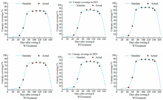 The accuracy of the model’s simulation results was evaluated using two years of data on cotton canopy cover, biomass, and yield, as shown in Table 5. In the simulation of canopy cover, the W3 treatment had the best simulation accuracy over the two years, while the simulation accuracy for W1 and W2 was lower but still within an acceptable range. For each treatment, d ≥ 0.955, R2 ≥ 0.967, and −1.35 ≤ RE ≤ 4.33, indicating excellent simulation accuracy of the module. The changes in canopy cover are shown in Figure 4. Before 45 days after sowing, the growth of canopy cover was slow. Subsequently, thanks to the dry sowing and wet emergence technique and sufficient water and fertilizer supply, canopy development accelerated, reaching a peak in canopy cover before 80 days and maintaining it for about 60 days. After 140 days, as the cotton aged, the canopy cover declined. The analysis shows that the simulation trend for each treatment was consistently in line with the measured trend throughout the growth period.