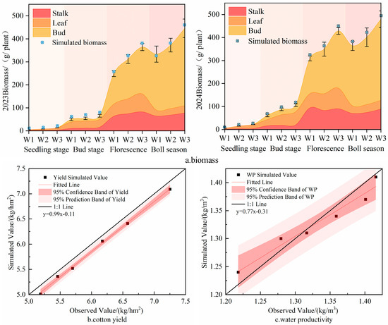 Simulation results of cotton biomass, yield, and WP under different irrigation levels for 2023–2024.