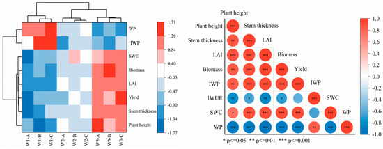 The variables of the clustering heat map and the correlation heat map include water productivity (WP), irrigation water productivity (IWP), soil water content (SWC), biomass (Biomass), leaf area index (LAI), yield (Yield), stem thickness (Stem thickness), and plant height (Plant height). The color gradient indicates the strength and direction of the correlation; red indicates a positive correlation and blue indicates a negative correlation. The depth of the color reflects the strength of the correlate.