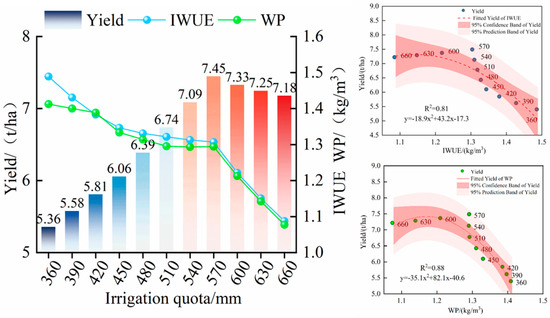 Scenario simulation results and fitting of cotton yield, IWP, and WP under different irrigation levels or amounts.