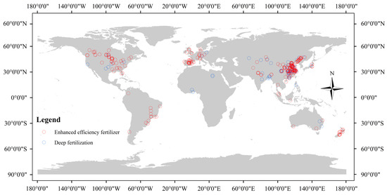 An article had to meet the following conditions before being included in the database: (1) All the research must have been conducted on-site; (2) The experiment must have used ordinary urea or shallow fertilization as the control group and synergistic fertilizer or deep fertilization as the treatment group, and conducted paired comparisons; (3) The experimental data must include the average, standard deviation or standard error, and number of replicates of our target parameters (yield, NUE, N2O, or NH3). The distribution of studies using the enhanced efficiency fertilizer strategy and deep fertilization strategy included in the global meta-analysis are shown in Figure 1.