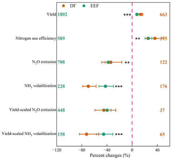 Percent change effects by deep fertilization and enhanced efficiency fertilizer management practices on yield, nitrogen use efficiency (NUE), N2O emission, NH3 emission, yield-scaled N2O emission, and yield-scaled NH3 emission. “*” indicates the significance of the heterogeneity test between DF and EEF, where “**” represents p < 0.01, and “***” represents p < 0.001.