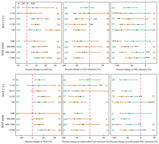 Percent changes caused by deep fertilization and enhanced efficiency fertilizer in the yield, nitrogen use efficiency (NUE), N2O emission, NH3 emission, yield-scaled N2O emission, and yield-scaled NH3 emission under different climate conditions. “*” indicates the significance of the heterogeneity test between DF and EEF, where “**” represents p < 0.01, and “***” represents p < 0.001.