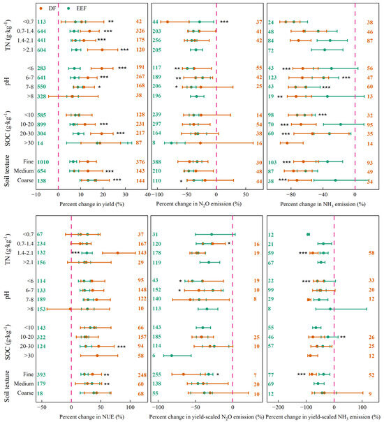 Percent changes caused by deep fertilization and enhanced efficiency fertilizer in the yield, nitrogen use efficiency (NUE), N2O emission, NH3 emission, yield-scaled N2O emission, and yield-scaled NH3 emission under different soil properties. “*” indicates the significance of the heterogeneity test between DF and EEF, where “*” represents p < 0.05, “**” represents p < 0.01, and “***” represents p < 0.001.