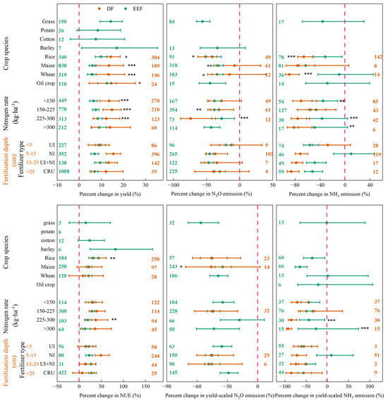 Percent changes due to deep fertilization and enhanced efficiency fertilizer in the yield, nitrogen use efficiency (NUE), N2O emission, NH3 emission, yield-scaled N2O emission, and yield-scaled NH3 emission under different management practices. “*” indicates the significance of the heterogeneity test between DF and EEF, where “*” represents p < 0.05, “**” represents p < 0.01, and “***” represents p < 0.001.