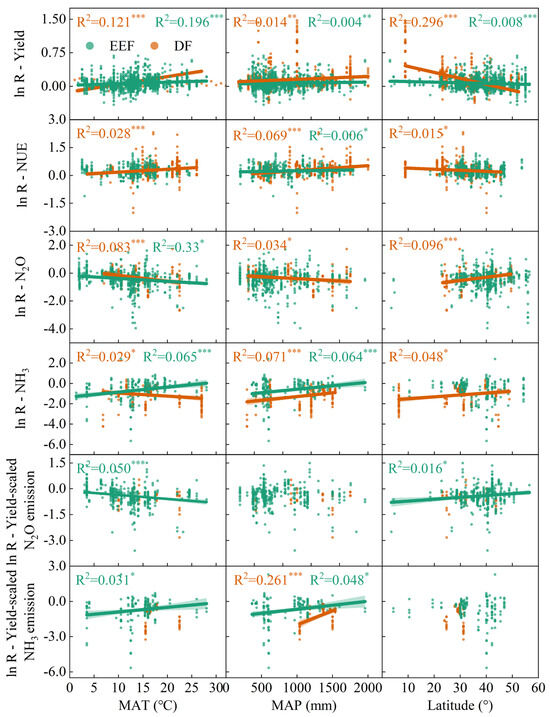 From the perspective of climate characteristics, the increased effects on the yield and NUE and the reduction effects on N2O emission, yield-scaled N2O emission under EEF increased with an increase in MAT and MAP and decreased with an increase in latitude (Figure 6). However, the reduction effects on NH3 emission and yield-scaled NH3 emission decreased with an increase in MAP and MAT under EEF.