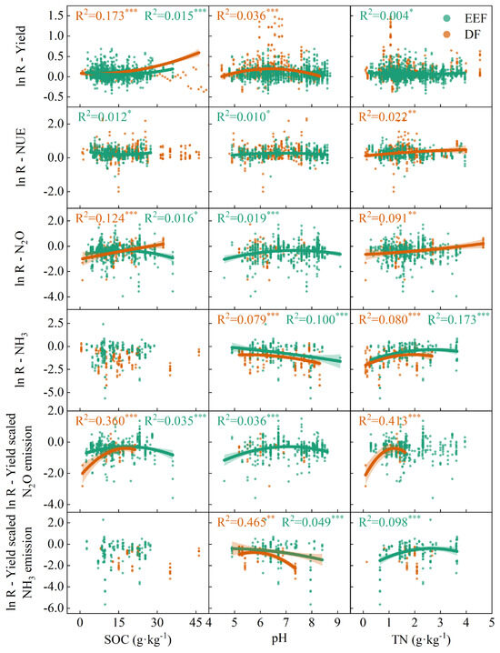 In terms of soil properties (Figure 7), under EEF conditions, the increase effect on the yield increased with an increase in SOC. However, the reduction effect on N2O emissions and N2O emissions per unit yield shows a trend of first decreasing and then increasing with the increase in SOC. The ln R of NH3 and yield-scaled NH3 emission under EEF and DF increased with soil pH. However, under EEF conditions, the ln R value of N2O emissions shows a trend of increasing and then decreasing with the increase in soil pH. The ln R of N2O, NH3 emission, yield-scaled N2O, and NH3 emission decreased with the increase in soil TN.