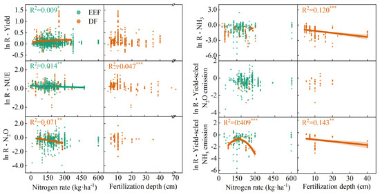In terms of field management practices (Figure 8), the increasing effect on the yield under the DF condition first increased and then decreased with the increase in the nitrogen application rate. However, the reduction effect on N2O increased, and the reduction effect on yield-scaled NH3 emission decreased first and then increased. The increasing effect on the NUE under EEF decreased with the increase in the nitrogen application rate. The reduction effect on NH3 emission increased with the increase in fertilization depth.