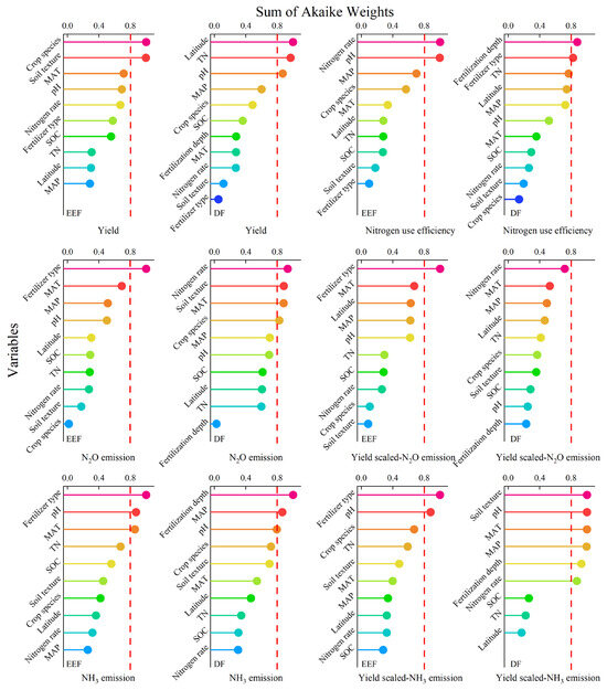 Model selection analysis showed that the most important factors related to the yield, NUE, and N2O and NH3 emission under EEF and DF were different (Figure 9). Overall, the fertilizer type was the most important factor related to the N2O, NH3, and yield-scaled N2O and NH3 emission under EEF. The nitrogen rate was the most important factor related to the N2O emission and yield-scaled N2O emission under DF, and the fertilization depth was the most important factor related to the NH3 emission and NUE under DF. The crop species and soil texture were the most important factors related to the yield under EEF, while under DF conditions, the main factors related to yield were latitude, soil TN, and soil pH.