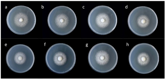 Mycelia growth of F. filiformis on PDA plates with different concentrations of Zn2+. (a–d) is the cultivated strain FV8, (e–h) is the wild strain FV18, and the Zn2+ concentration in PDA plates from left to right is 0, 10, 20, and 30 mg/L.