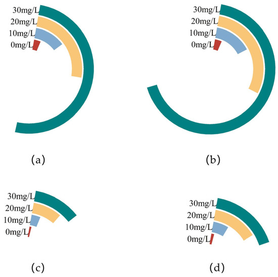 The bioconcentration factor (BCF) is commonly used to evaluate the degree of metal element accumulation in organisms [32]. According to the BCF to calculate the Zinc enrichment coefficient in the mycelium of F. filiformis, it can be obtained (Table 4): the Zinc enrichment coefficients of the mycelium of FV8 and FV18 were greater than 1 in the PDA plates added with different concentrations of Zn2+, and all showed an increasing trend with rising Zn2+ concentration. In the 30 mg/L treatment, the Zinc enrichment coefficients of FV8 and FV18 were significantly increased by approximately 40.05% and 55.11%, respectively, compared with that of the control groups. While the zinc enrichment rates of total mycelia in different concentrations of Zn2+ PDA medium differed from the above. The maximum Zinc enrichment of total mycelia in FV8 and FV18 was 0.429 and 0.672, respectively, in the 20 mg/L treatment. The results demonstrated an increasing trend followed by a subsequent decreasing trend with increasing Zn2+ concentrations. However, no significant differences were observed between the different concentrations. Consequently, the wild strain FV18 exhibited a more pronounced Zinc enrichment capacity when considered collectively.