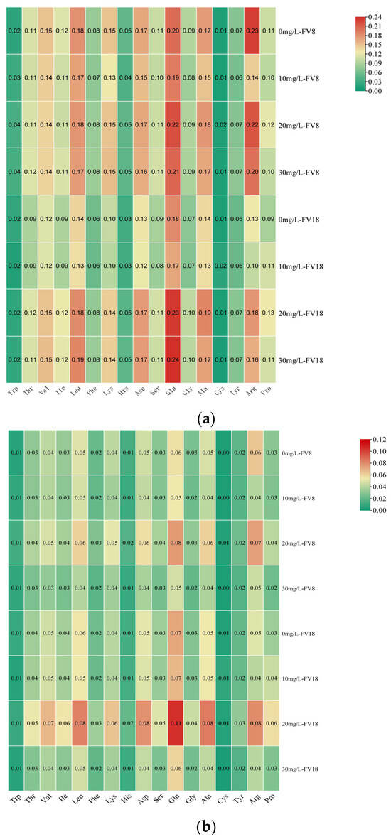 As shown in Figure 3a, the content of each amino acid was determined in the mycelia of F. filiformis treated with different concentrations of Zn2+. A total of nine essential amino acids including those necessary for infants are necessary for the human body [33]. The mycelia of F. filiformis have been observed to contain eight of these essential amino acids. However, due to the presence of methionine content of less than 0.0075 g/100 g, not all of these amino acids could be detected. Of these, lysine (Lys), valine (Val), and leucine (Leu) were found to be present in notably higher amounts. The most prevalent non-essential amino acids include glutamic acid (Glu), aspartic acid (Asp), alanine (Ala), and arginine (Arg). As the concentration of Zn2+ increased, significant changes in the amino acids Lys, His, and Arg in FV8 were observed. In the 20 mg/L treatment, Lysine content increased compared to the control group, reaching the highest. In contrast, varying concentrations of Zn2+ resulted in decreased content of His and Arg compared to the control group. In different concentrations of Zn2+, the content of amino acids measured in FV18 increased with increasing Zn2+ concentration except for Trp, Cys, Arg, and Pro, their contents did not differ significantly. Therefore, only lysine content was elevated in both strains compared to their corresponding controls under different concentrations of Zn2+ treatment. The analysis revealed a correlation between the specific and total content of amino acids in different concentrations of Zn2+ PDA medium (Figure 3b). It was shown that the content of Val and lysine in the mycelium of FV8 and FV18 were more than other essential amino acids, and the content of Glutamic acid and Arg in the non-essential amino acids were more, both of which were highest at the concentration of 20 m/L Zn2+ PDA medium. At this concentration glutamic acid content was significantly increased in both, and lysine content was 0.052 g/100 g and 0.065 g/100 g, respectively.