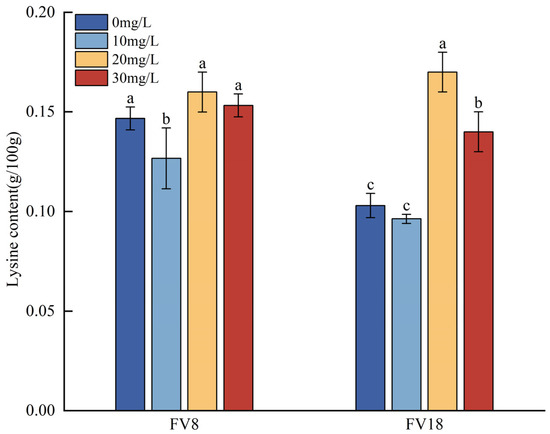 According to the lysine content in F. filiformis after treatment with different concentrations of Zn2+ (Figure 4), the lysine content of FV8 and FV18 increased compared with their corresponding control groups in the 20 mg/L treatment, and both were the highest values. The Lysine content of FV18 which increased by approximately 38.8% was high in comparison with that of FV8 at the same concentration. In the 10 mg/L treatment, the lysine contents of FV8 and FV18 were lower than their corresponding controls, with a decrease of approximately 15.79% and 6.5%, respectively. Comparing the lysine content between different strains at the same concentration showed that wild strain FV18 was lower than cultivated strain FV8 in all cases.