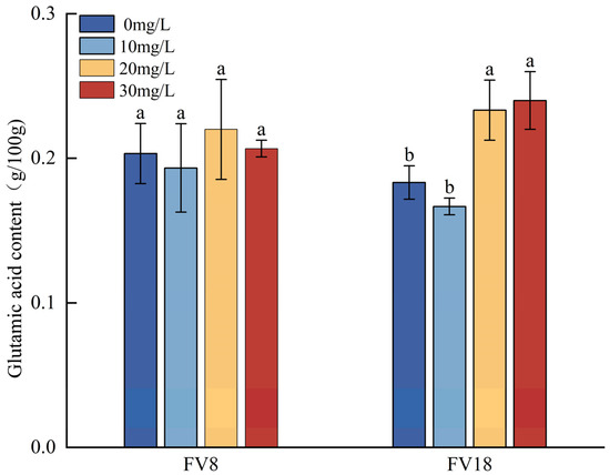 Based on the glutamic acid content detected in the F. filiformis treated with different concentrations of Zn2+ (Figure 5), the highest glutamic acid contents which were found in FV8 and FV18 were, respectively, in the 20 mg/L and 30 mg/L treatment, as compared to the controls. Compared to the corresponding controls of the two strains, the FV18 demonstrated a significant increase in glutamic acid content of approximately 27.28% and 39.13%, respectively, at the Zn2+ concentrations of 20 mg/L and 30 mg/L. In contrast, the glutamic acid content in the FV8 sample exhibited higher levels compared to the control in both cases, though not significantly different. Comparing different strains at the same concentration showed that the glutamic acid content of FV8 and FV18 decreased by approximately 4.92% and 9.1%, respectively, compared with their respective controls at a Zn2+ concentration of 10 mg/L, but neither of them were significantly different. As shown, the glutamic acid content of the wild strain FV18 was less than that of the cultivated strain FV8 in normal PDA medium, but the glutamic acid content of FV18 was approximately 4.5% higher than that of FV8, when the concentration of Zn2+ was 20 mg/L.