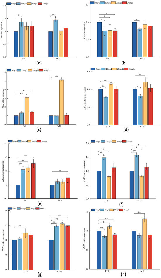 Relative expression of key enzyme genes in lysine synthesis under different concentrations of Zn2+ treatment. 0 mg/L, 10 mg/L, 20 mg/L, and 30 mg/L were expressed as the added concentrations of Zn2+ in PDA medium, (a) is the AAR relative expression of F. filiformis mycelium, (b) is the SR relative expression of F. filiformis mycelium, (c) is the SDH relative expression of F. filiformis mycelium, (d) is the HCD relative expression of F. filiformis mycelium, (e) is the HDH relative expression of F. filiformis mycelium, (f) is the AAT relative expression of F. filiformis mycelium, (g) is the HCS relative expression of F. filiformis mycelium, (h) is the HAH relative expression of F. filiformis mycelium. * and ** were expressed at 5% and 1% levels compared with the control groups.