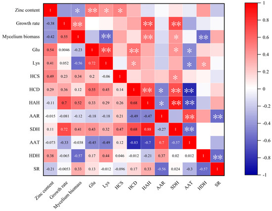 There were positive correlations between lysine content and zinc content, growth rate, glutamic acid content and relative expressions of HCD, HAH, SDH and HDH in the key enzyme genes of the lysine synthesis pathway of F. filiformis (Figure 7). Among them, the lysine content of F. filiformis showed a high positive correlation with glutamic acid content with a correlation coefficient of 0.72; the correlation coefficient with zinc content was 0.41 which belonged to a significant positive correlation. And the expressions of HDH and HCD in the key enzyme genes of the lysine synthesis pathway had significant positive correlations with the Lysine content with the correlation coefficients of 0.44 and 0.45. And there was a highly significant negative correlation between Lysine content and mycelia biomass of F. filiformis, with a correlation coefficient of −0.56. A highly significant negative correlation between the relative expression of AAT among its synthesis of key enzyme genes and Lysine content, with a correlation coefficient of −0.49. The correlation between lysine content and mycelial growth rate of F. filiformis was found to be negligible, indicating that lysine content was not associated with mycelia growth rate in this experiment. According to Figure 7, it can be discerned that the glutamic acid content of F. filiformis mycelia exhibited a highly positive correlation with zinc content and HCD and SDH which are the key enzyme genes of the lysine synthesis pathway, with correlation coefficients of 0.55 and 0.43, respectively. Additionally, the glutamic acid content exhibited a significant negative correlation with AAT, with a correlation coefficient of −0.45.